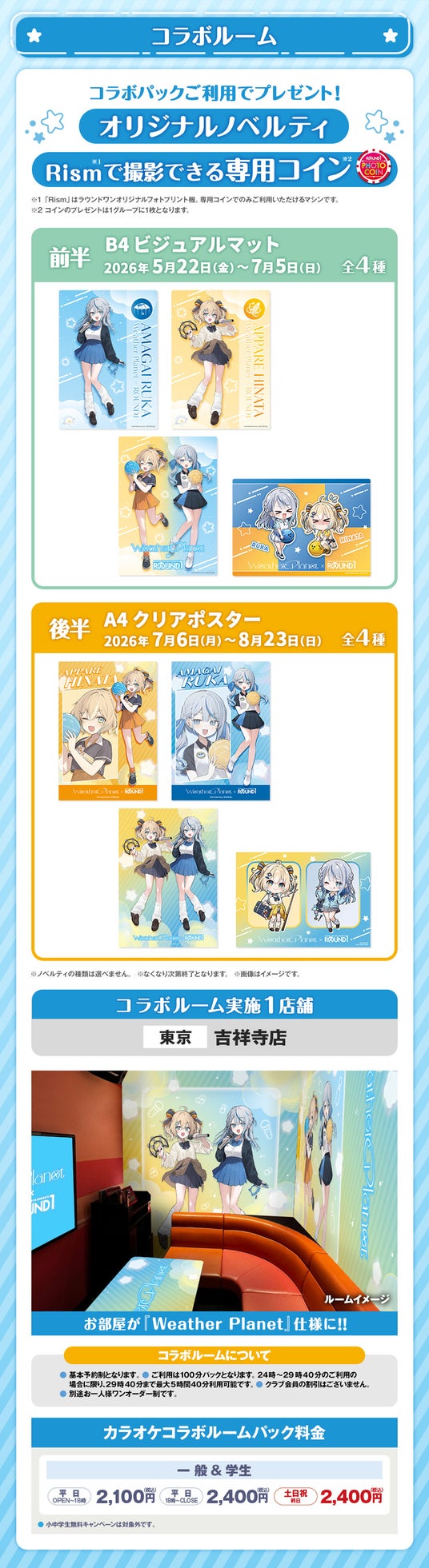 ROUND1のオリジナルフォトプリント機「Rism(リズム)」に、『WeatherPlanet』のコラボデザインが登場します。期間中、コラボパックをご利用の方、またはコラボルームをご利用いただいた方には、限定で「Rism」専用コインを1グループにつき1枚プレゼントいたします。