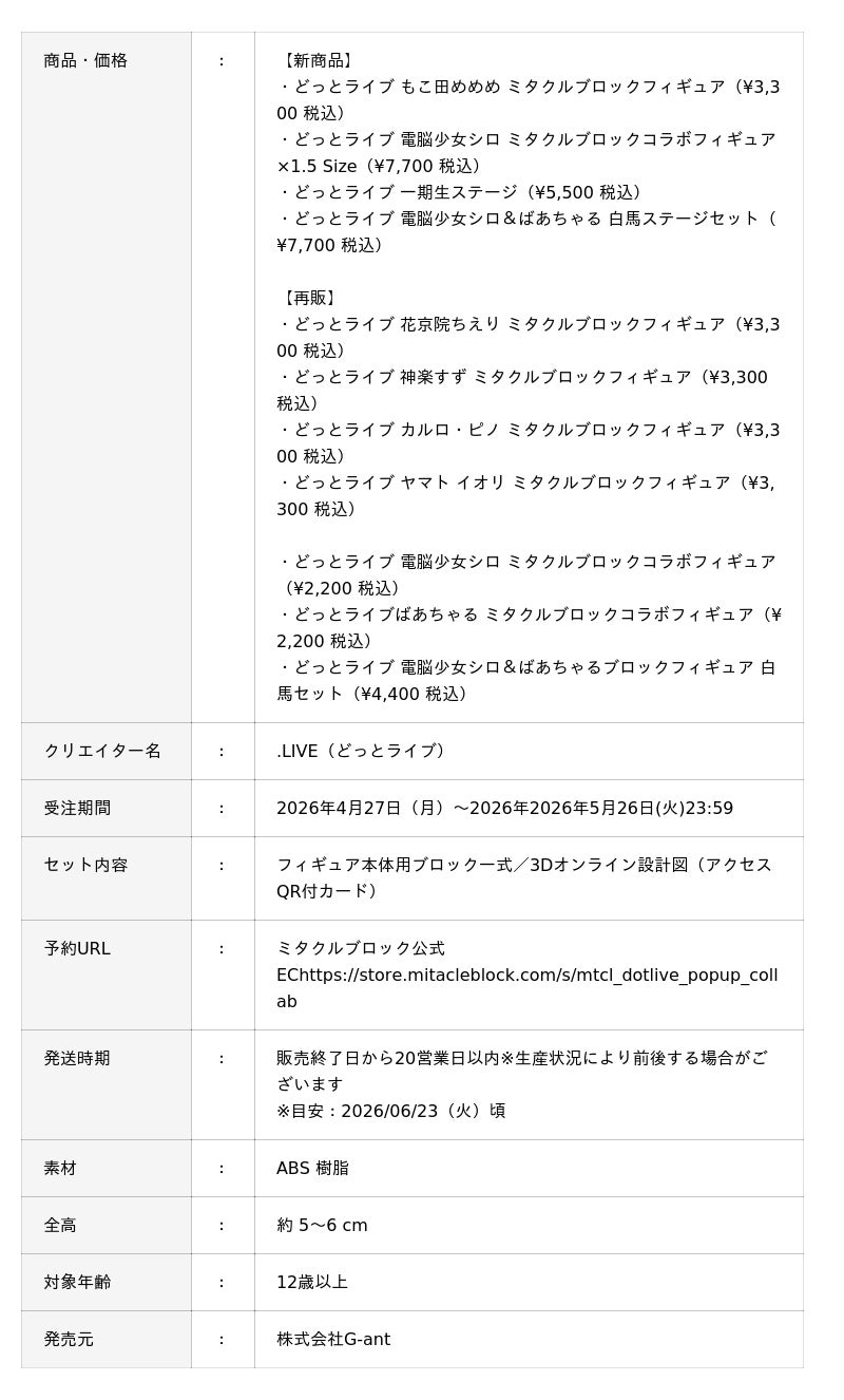 株式会社G-ant(所在地:東京都中央区、代表取締役:平川 彰悟)は、株式会社アップランド(所在地:世田谷区)が運営するVTuberプロダクション「.LIVE(どっとライブ)」とのコラボレーション第3弾として、2026年4月16日(木)から4月26日(日)にかけてMITACLE BLOCK 東池袋店にて開催したポップアップショップの全コラボフィギュアについて、事後通販をミタクルブロック公式オンラインストアにて開始することをお知らせいたします。