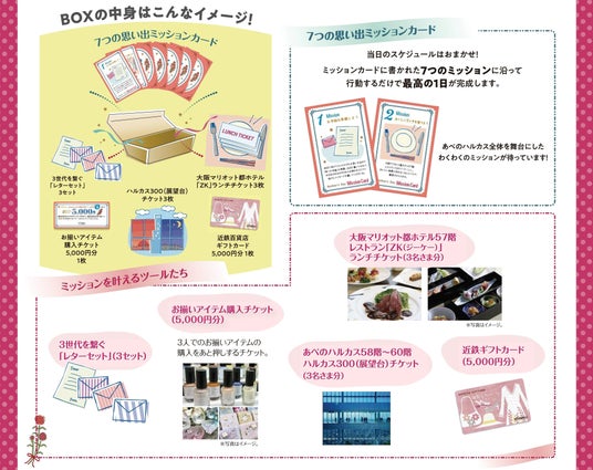 「おばあちゃん、お母さん、そして私。」今年の母の日は、あべのハルカスが3世代の特別な時間を完全プロデュース!「何をすれば喜んでくれるかな?」「誘うのはちょっと照れくさい…」そんなあなたの背中を優しく押す、母の日プロデュースBOXが登場。7つのミッションをクリアするたびに家族の笑顔が増えていく、3人の体験と思い出を生み出すスペシャルなBOXです。