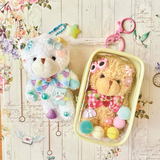 フリルやボンボンが付いたバッグにお好きな目や耳などをレイアウト、可愛いオリジナルバッグに仕上げます。