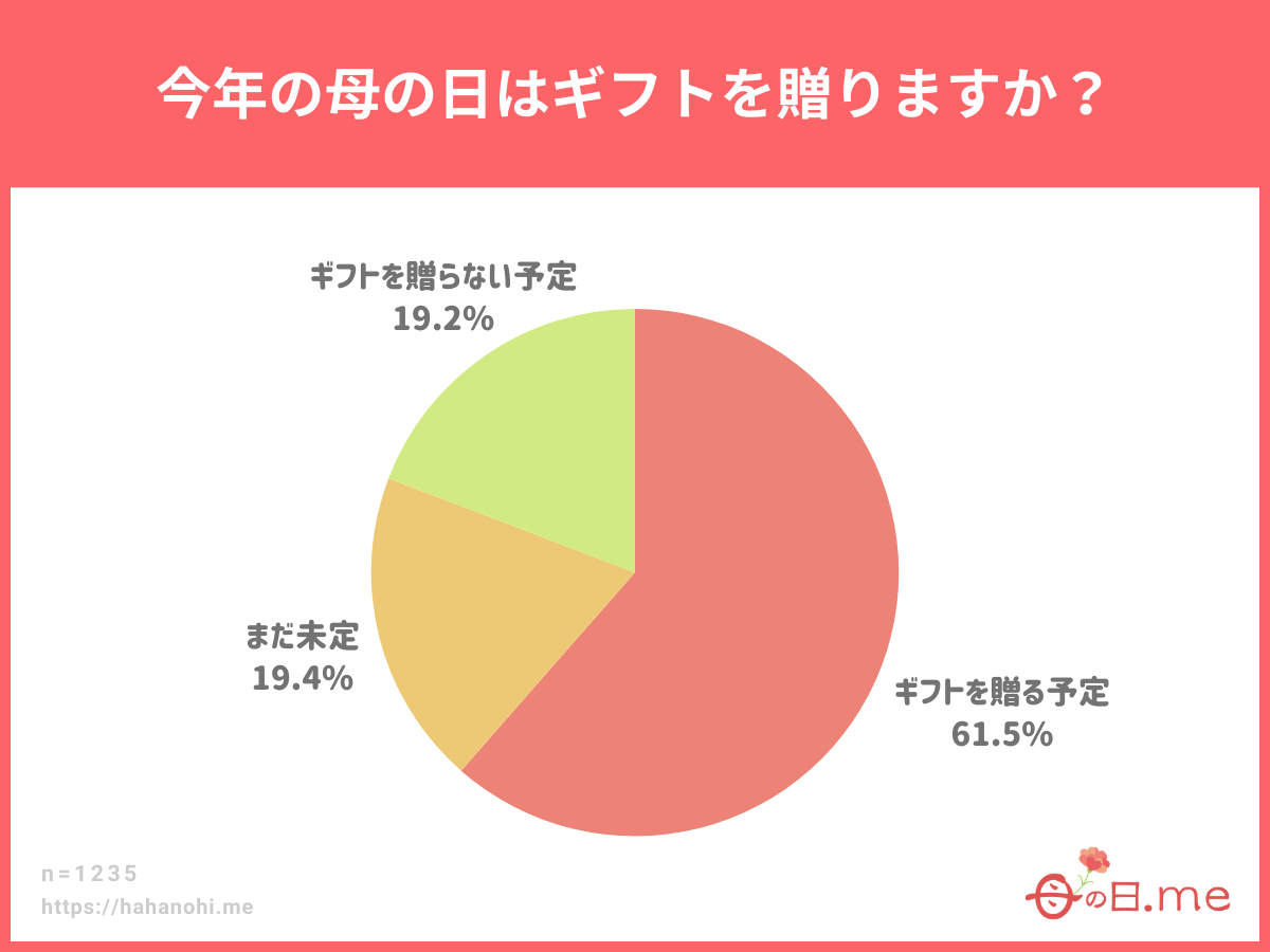 「今年の母の日にギフトを贈る予定」は61.5%と、前年とほぼ同水準で推移しており、母の日は安定したギフトイベントとして定着しています。一方で「未定」は減少し、早期に意思決定する傾向が強まっています。