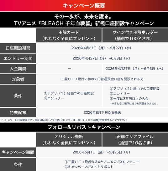 株式会社三菱UFJフィナンシャル・グループ(以下、MUFG)の連結子会社である株式会社三菱UFJ銀行(以下、当行)は、話題の人気アニメ『BLEACH 千年血戦篇』とタイアップし、アプリで普通預金口座を開設した方を対象とした、限定オリジナルグッズがもらえる特別キャンペーンを2026年4月27日(月)より実施します。