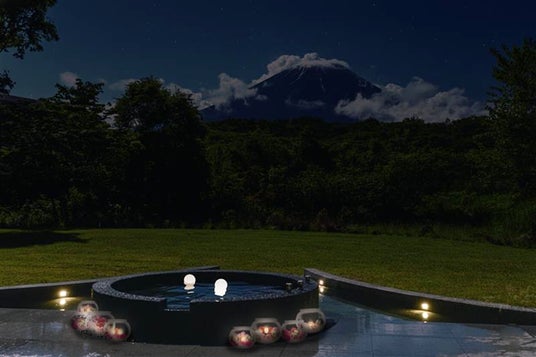 サウナ室はサウナプロデューサー「ととのえ親方」こと松尾大氏が監修。大きめの薪ストーブを配置している為、本格的なセルフロウリュが楽しめる他、プライベートな専用ガーデンには富士山をモチーフにした水風呂と露天風呂も用意しています。サウナ室にいながら富士山を眺められる開放的な設計もリトリート時間にぴったりの幻想的空間です。