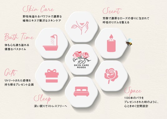 お部屋には6つのコンテンツ(体験)をご用意。お部屋を象徴する空間演出や生花を使用した演出だけでなく、日本未発売のエッセンシャルオイルの香り、そして、大人気のローズスキンケア・ボディケア商品を中心に現品12種類を贅沢に取り揃え、パワフルな植物エキスと芳醇で深みのある自然の香りを楽しめる、新たな肌と心をととのえる“リチュアル(儀式)”をご提供いたします。 6つのコンテンツで自然との融合が叶うリトリート体験は、ミルフィーユのように重なり合い、体と感情をさらにほぐしながら、深く癒されるリラックスタイムへ導きます。