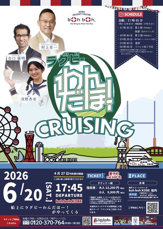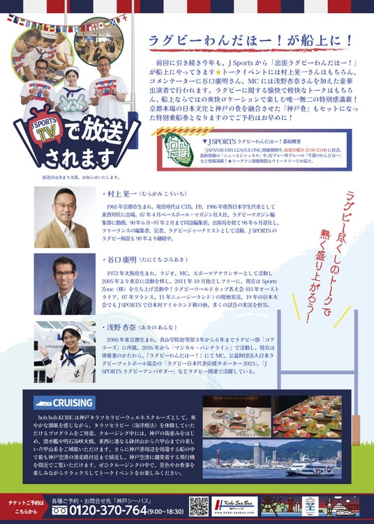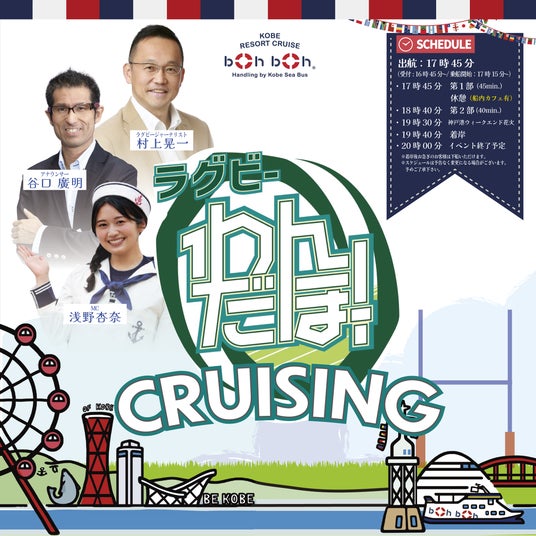 番組の顔であるMC浅野杏奈さん、コメンテーター谷口廣明さん、そして神戸シーバスが 2023 年より毎年開催している「ラグビー愛クルーズ」でもMCを務める村上晃一さんを迎え、潮風を感じられる非日常なロケーションで生トークライブをお楽しみいただけるクルージングとのコラボレーションイベントです。