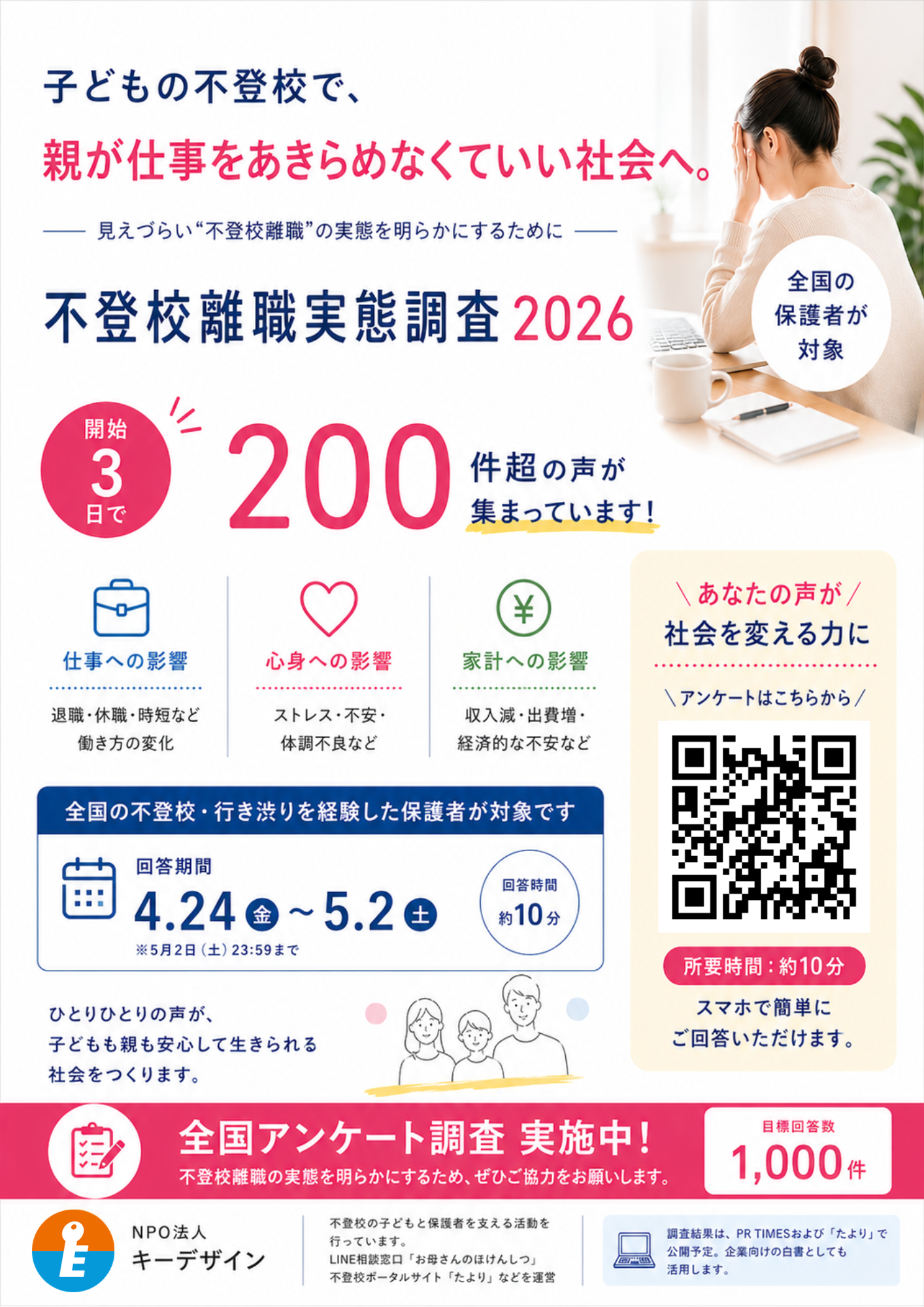 NPO法人キーデザイン(栃木県宇都宮市、代表理事:土橋優平)は、全国の不登校・行き渋りを経験した子どもの保護者を対象に、保護者の就労・家計・心身への影響を明らかにする「不登校離職 実態調査2026」を開始しました。