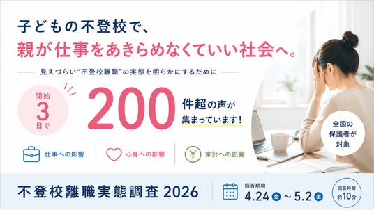 全国の不登校子育てを経験する、または過去に経験した保護者を対象に、1,000件の回答を目標として実施しています。開始から3日目となる4月27日午前時点で、すでに200件を超える回答が寄せられています。