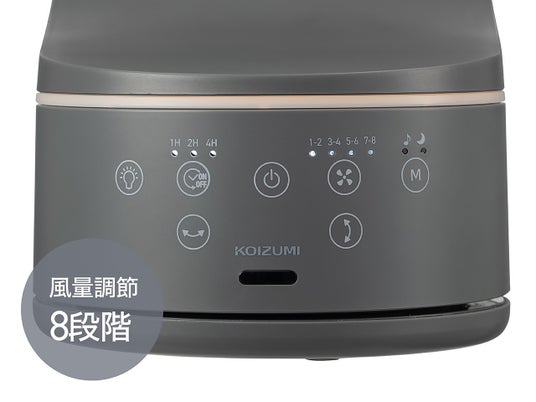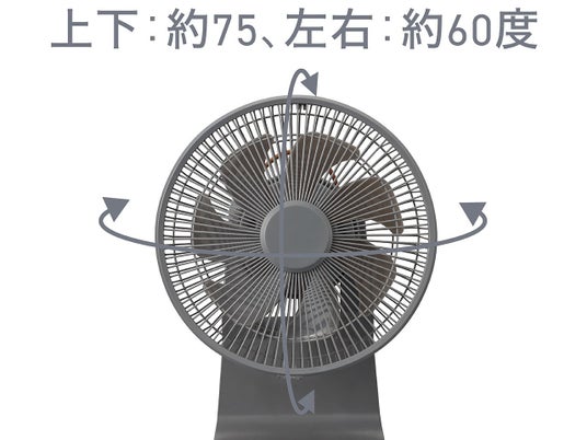 ・8段階の豊富な風量調節。左右自動首振り約60°、上下自動首振り上約60°、下約15°。
