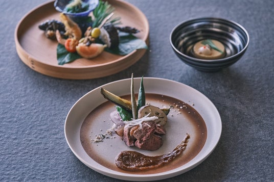 一皿一椀、地元の旬の食材を使用した御花の会席料理。明治時代、立花伯爵家が過ごした居間をそのまま料亭として使用した客室にて、御花が百年後につなぎたい、物語のある食材をコースに仕立ててお届けします。お飲み物は料理の味を最大限に引き立てる、ペアリングドリンクをご提供します。