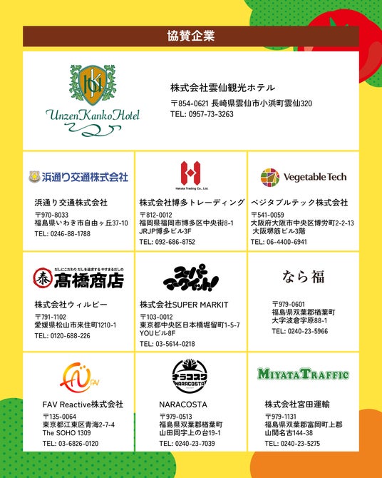 株式会社雲仙観光ホテル・株式会社ウィルビー・ベジタブルテック株式会社・株式会社博多トレーディング・浜通り交通株式会社・NARACOSTA・なら福・FAV Reactive株式会社・株式会社SUPER MARKIT・株式会社コミットコーポレーション・株式会社宮田運輸・株式会社門崎・株式会社東日本計算センター・関彰商事株式会社・株式会社かねまん本舗・株式会社ジェイアイオフィス・one zu gate・株式会社日章冷凍