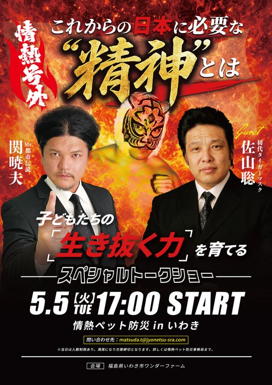 同会場にて、無料でMr.都市伝説 関暁夫と、初代タイガーマスク 佐山聡氏の当日限定トークショーを開催いたします!これからの日本に必要な“精神”や子どもたちの「教育」について熱く語り合います!