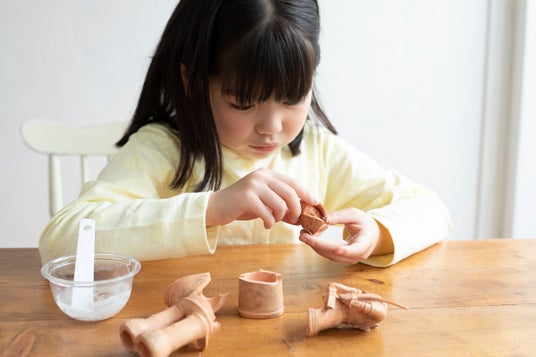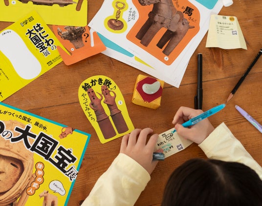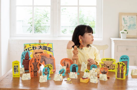 「はにわの大国宝展」は、はじめて歴史にふれる子どものための体験型のキットです。東京国立博物館が監修の本商品は、国宝のはにわ「挂甲の武人」(けいこうのぶじん)を組み立てたり、勾玉を石からみがいたりして、おうちに小さな博物館をつくって国宝展を開催することができます。自分の手を動かして工作を行い、できたものを道具にして探究していく教材です。つくり、観察し、考え、まとめる。その一連の体験を通して、学びを自分ごととして深めていきます。