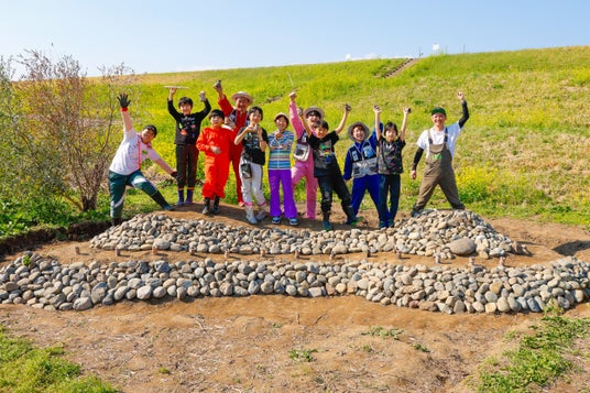 ▲読者の子どもたちと全長約6mの古墳を手作りしました。