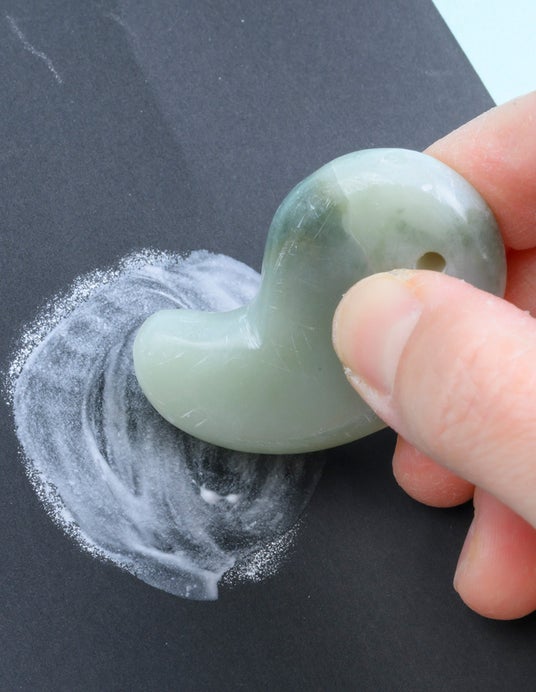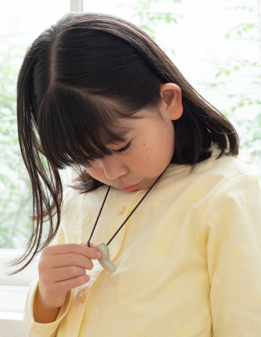 やわらかい天然石「滑石」を削り、みがいて、古代のアクセサリー勾玉をつくります。本誌で紹介している国宝の勾玉を見ながら、粗さのちがう4枚の耐水ペーパーで形を整え、ピカピカにみがき上げていきます。