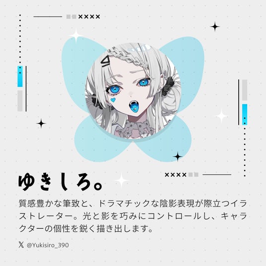 質感豊かな筆致と、ドラマチックな陰影表現が際立つイラストレーター。光と影を巧みにコントロールし、キャラクターの個性を鋭く描き出します。
