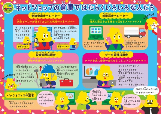 ネットショップの注文からお届けまでをつなぐ物流のしくみを通して、子どもたちが“ものが届くまでの流れ”と“くらしを支える仕事”の大切さを学べる内容です。