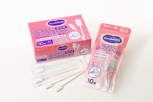 綿棒一筋、創業59年目の綿棒メーカー株式会社山洋(本社:大阪府富田林市、代表取締役社長:日比 努)は、急激な高齢化社会に伴う口腔ケア需要の増大を受け、介護・衛生現場の負担を軽減するため、ガーゼ素材のメリットを最大限活かした介護補助用綿棒の新しいアイテムとして新商品ブランド「ピュアモア 口腔ケア ガーゼスティック」シリーズ2種(袋入り10本/箱入り50本)を発売致しました。