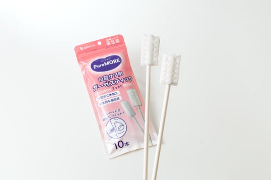 私は90歳の親に口腔ケアをしています。歯ブラシでは歯を磨き、その他の口腔内をスポンジスワブを利用していますがもっとキレイにしてあげたいと、特に舌苔(舌の汚れ)が取れにくいのも何としてあげたく。綿棒メーカーで働いているので長い大きい綿棒を利用していたのですが、あるとき介護施設現場でベテランの介護師が指にガーゼを巻いて舌苔のケアをしており汚れが取れているのがハッキリ見えました。「指を口に入れるのも入れられるのも嫌だろうな~」単純にそう思いましたが、それなら綿棒の先の綿をガーゼ素材に変えたら指も噛まれず良いのではと。これを商品に出来たら解決できるのでは?そこから介護現場でマーケティング調査をしメリット・デメリットを徹底的に調査。安全性の強化に加え、口腔内の汚れを効率的に絡め取る「特殊なガーゼ立体波型加工」を採用し、介護現場でのエビデンスも取れ この程「ピュアモア 口腔ケア ガーゼスティック」の発売に至りました。