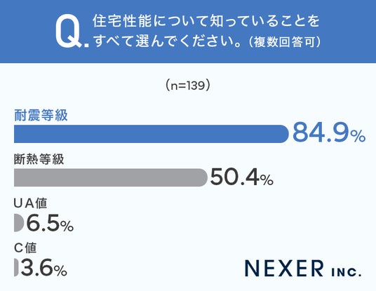 「耐震等級」の認知度が84.9%と突出して高く、次いで「断熱等級」が50.4%、「UA値」が6.5%、「C値」が3.6%という結果になりました。