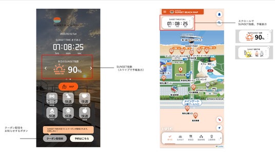 今回のリリースに合わせ、日没前後にSUNSET指数と連動したクーポンを配信する機能を追加します。クーポンが配信されている施設はマップ上で確認でき、SUNSET指数のスコアに応じてクーポンの内容が変わります。指数が高い日には、よりお得なクーポンが配信されるなど、夕日の思い出をさらに特別なものにできます。