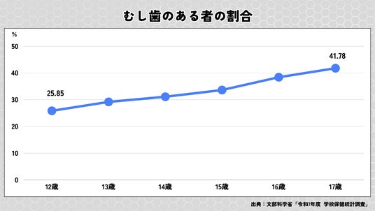 近年フッ化物の普及などにより、むし歯を経験する子どもは減少傾向にあります。しかし文部科学省の学校保健統計調査で、むし歯のある12歳と17歳の割合を比較すると1.6倍に。特に中学生や高校生は、生活環境の変化により“むし歯リスクが一気に高まる時期”であることが示されています。