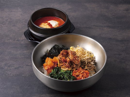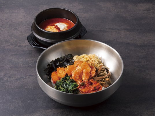 甘辛な味付けサーモンを豪快に混ぜる王道ビビンバに、熱々スンドゥブをセット。