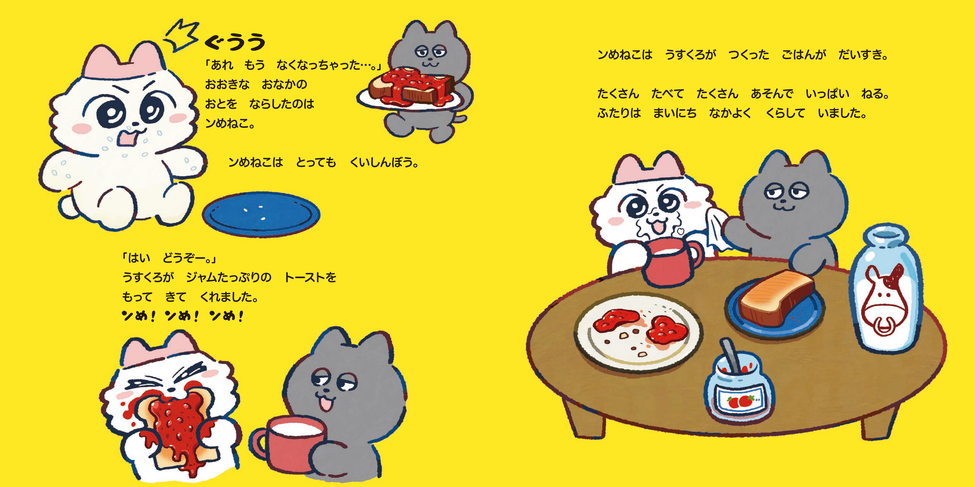 本書の魅力は、個性的なふたりのキャラクターと、その関係性です。笑ったり泣いたり、元気で忙しない「ンめねこ」とクールで面倒見のよい「うすくろ」という正反対なふたりは、互いを補完しあう名コンビ。ふたりが協力しながらお弁当を作りあげていく様子に、思わず応援したくなること間違いなしです。