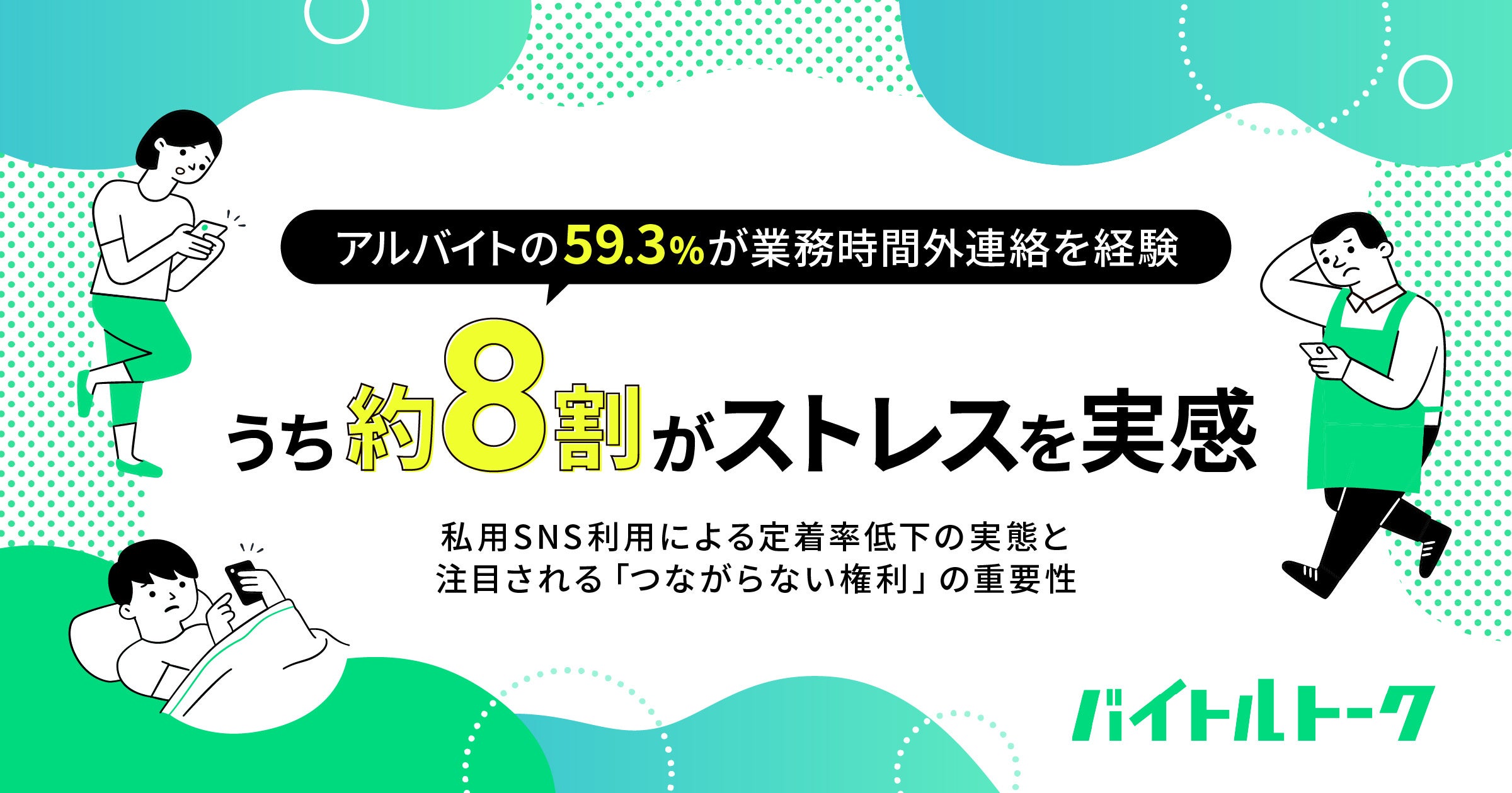 本調査の結果、勤務時間外に業務連絡を受け取っているアルバイト従業員の約8割(78.4%)(※)がストレスを感じており、さらに勤務時間外に連絡を受け取っているアルバイト従業員のうち約2人に1人(54.7% )(※)が、それが原因で実際に「辞めたい」と思った経験があるという実態が浮き彫りとなりました。