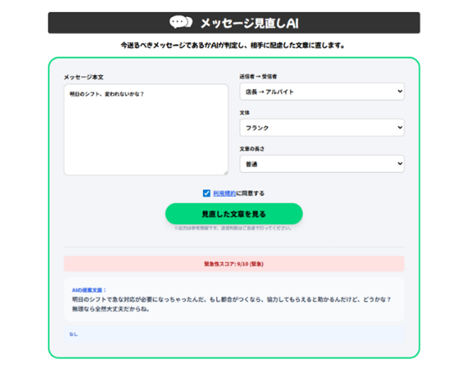 店舗管理者・アルバイト従業員双方が利用可能です。送信者の立場を選択し、伝えたいメッセージ内容を入力するだけで、AIが相手への配慮とビジネスマナーを兼ね備えた適切な文章を生成します。