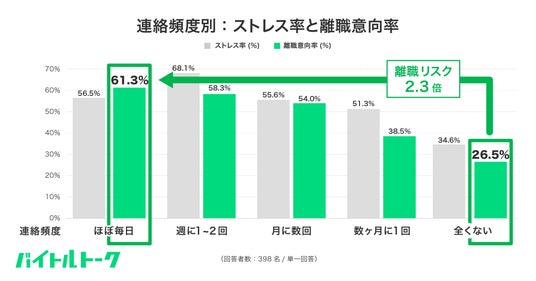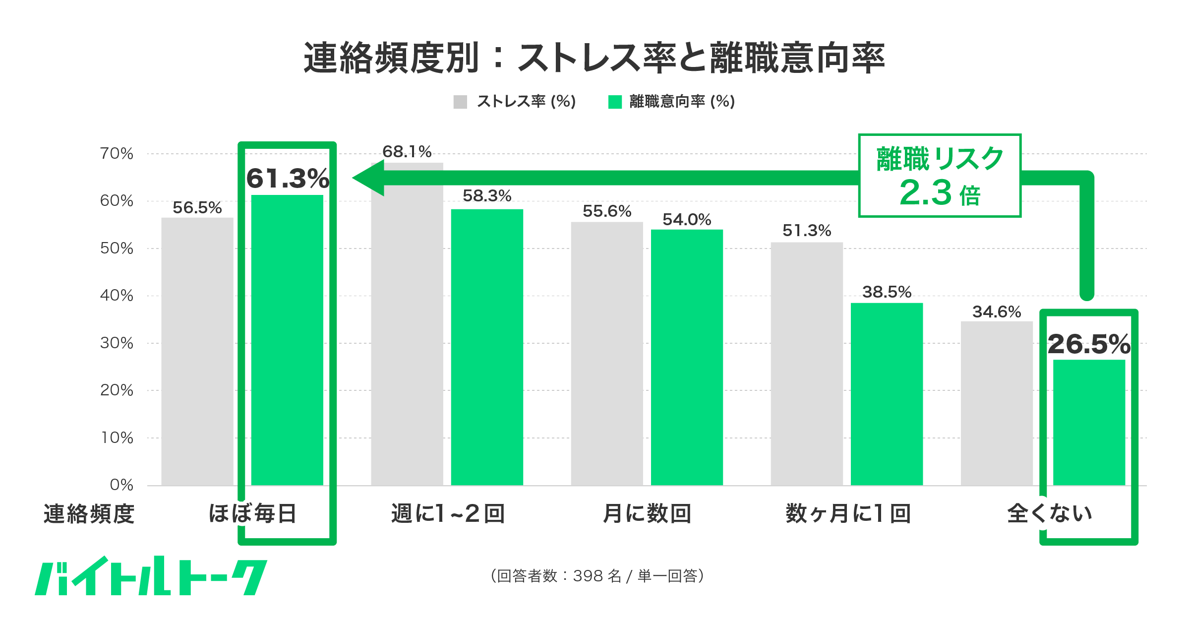 勤務時間外に連絡を受けているアルバイト従業員のうち過半数を超える54.7%がそれを理由に「辞めたい」と思った経験があると回答しました。特に連絡頻度との相関は顕著でほぼ毎日連絡がある層は61.3%が離職を意識しています。これは「全く連絡が無い層(離職意向26.5%)」と比較すると離職のリスクが2倍以上にまで跳ね上がることを示しています。このデータから、時間外連絡のコントロールが定着率に影響すると考えられます。