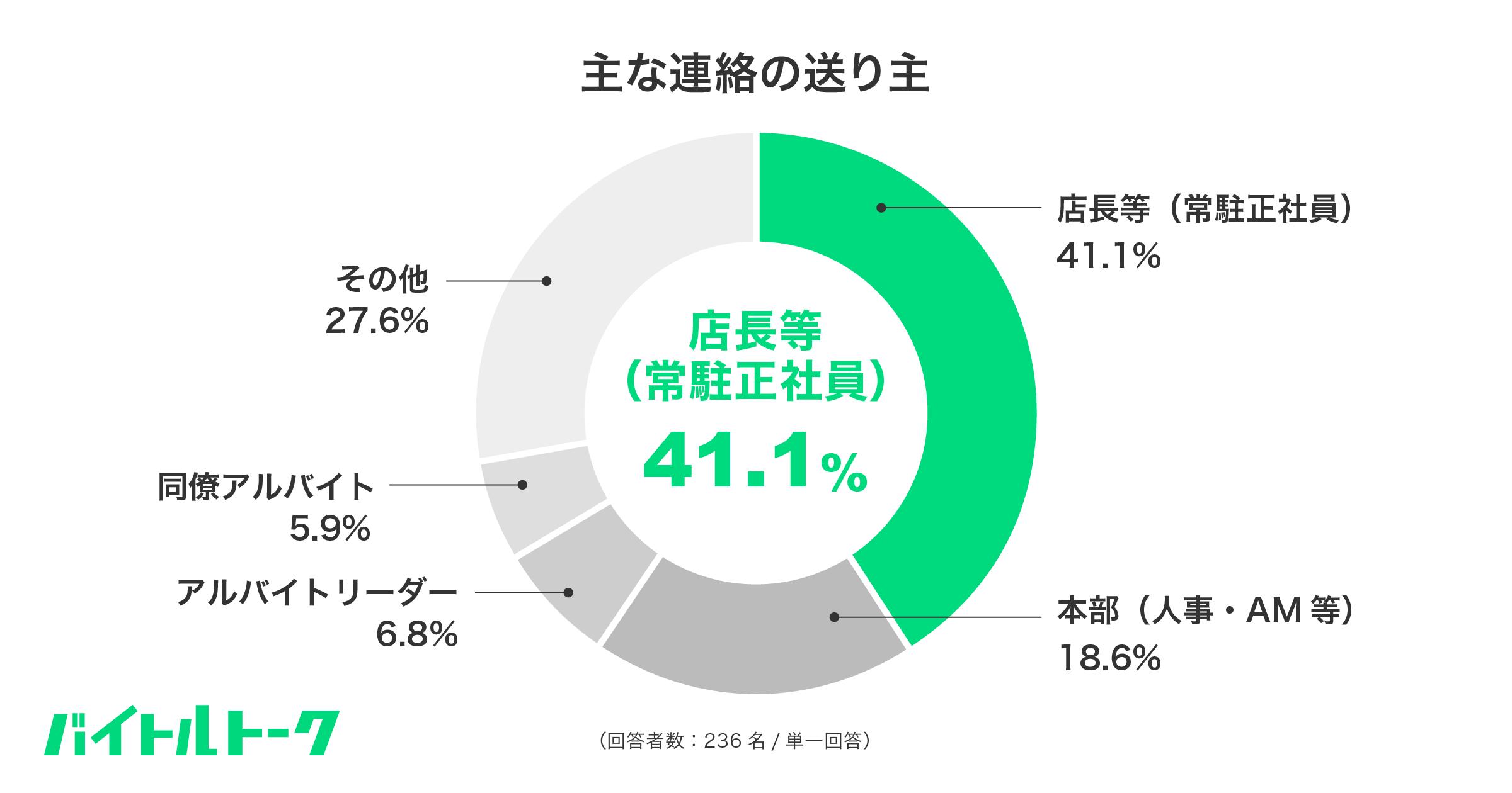 連絡元として最も多いのは「店長等(常駐正社員)」ですが、その連絡に対し78.4%のアルバイト従業員がストレスを感じている実態があります。