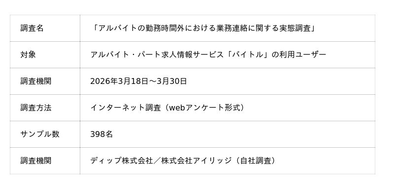 ディップ株式会社(以下「当社」)と株式会社アイリッジ(東京証券取引所グロース:3917、以下「アイリッジ」)は、アルバイト・パート求人情報サービス「バイトル」を利用するユーザー398名を対象に「アルバイトの勤務時間外における業務連絡に関する実態調査」(以下「本調査」)を実施いたしました。
