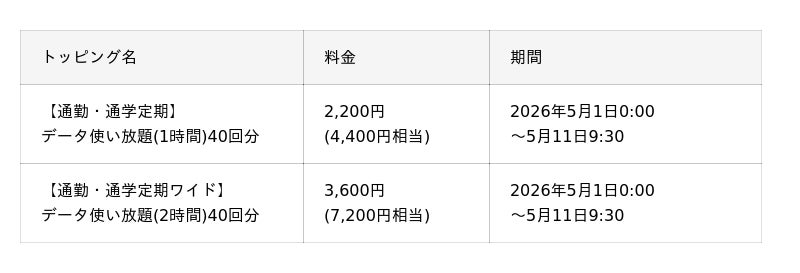 「通勤・通学定期」は、「データ使い放題(1時間)」40回分(4,400円相当)(注2)を半額の2,200円で利用できます。また「通勤・通学定期ワイド」は、「データ使い放題(2時間)」40回分(7,200円相当)(注3)を半額の3,600円で利用でき、状況にあわせて、おトクな2種類からお選びいただけます。