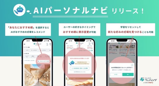 株式会社くふうウェディング(本社:東京都中央区、代表取締役社長:貝瀬 雄一、以下「くふうウェディング」)は、運営するウェディング総合情報サイト「みんなのウェディング」において、AIを活用して提供する情報をユーザーごとにパーソナライズ化する「AIパーソナルナビ」を提供開始いたしました。