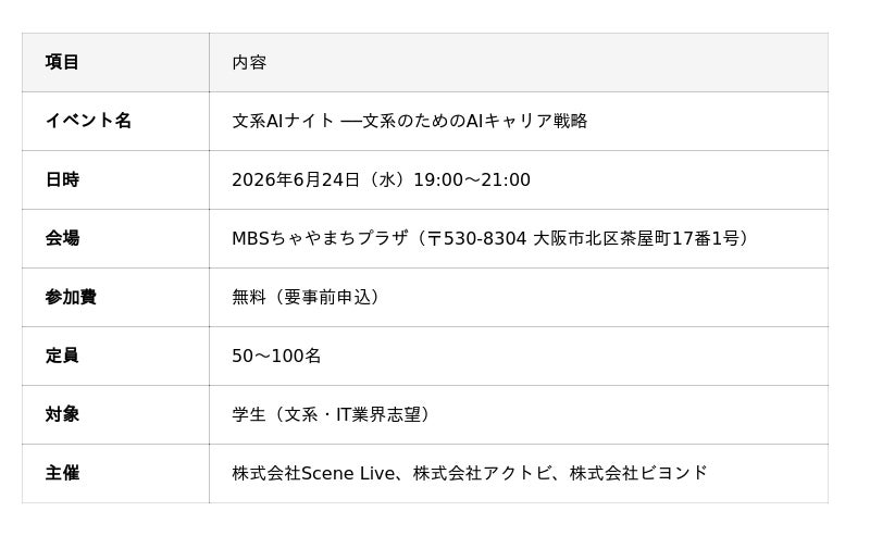 コールシステムの開発・提供をおこなう株式会社Scene Live(本社:大阪府大阪市、代表取締役社長:磯村 亮典)は、株式会社アクトビ(本社:大阪府大阪市、代表取締役社長 兼 CEO:藤原 良輔)および株式会社ビヨンド(本社:大阪府大阪市、代表取締役:原岡 昌寛 )とともに、2026年6月24日(水)、MBSちゃやまちプラザ(大阪市北区茶屋町)にて、文系大学生を対象としたキャリアイベント「文系AIナイト ──文系のためのAIキャリア戦略」を共同開催します。