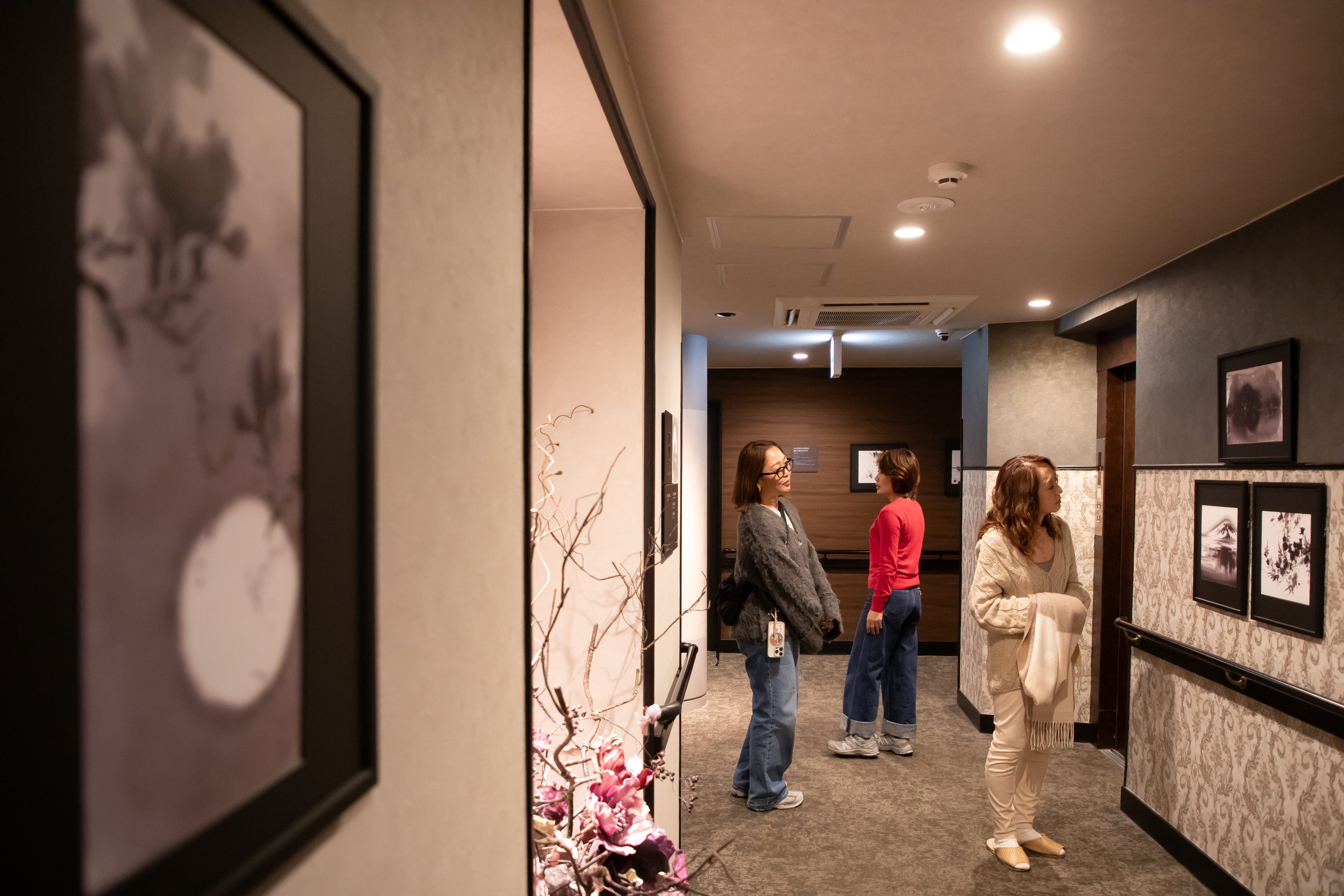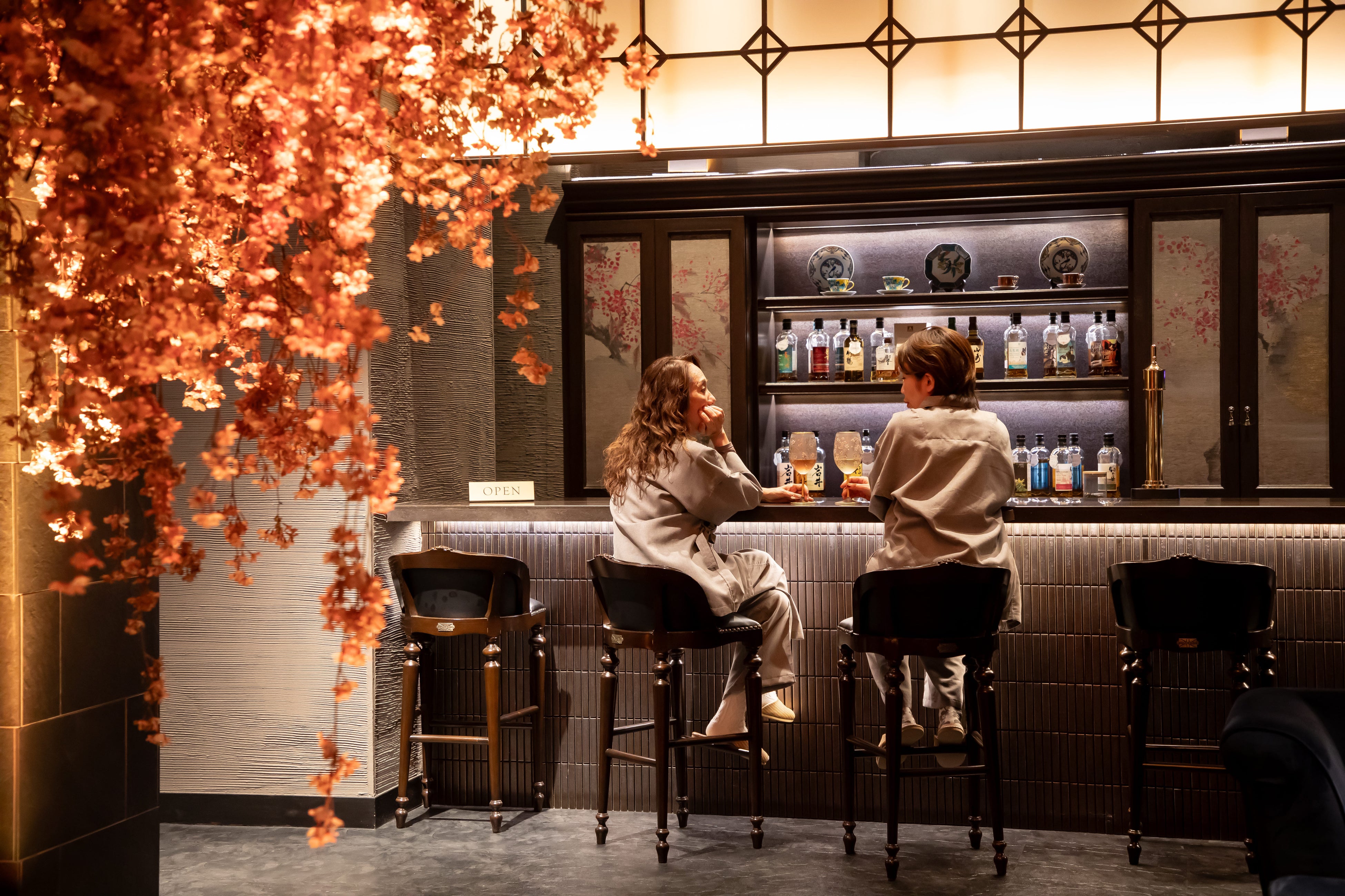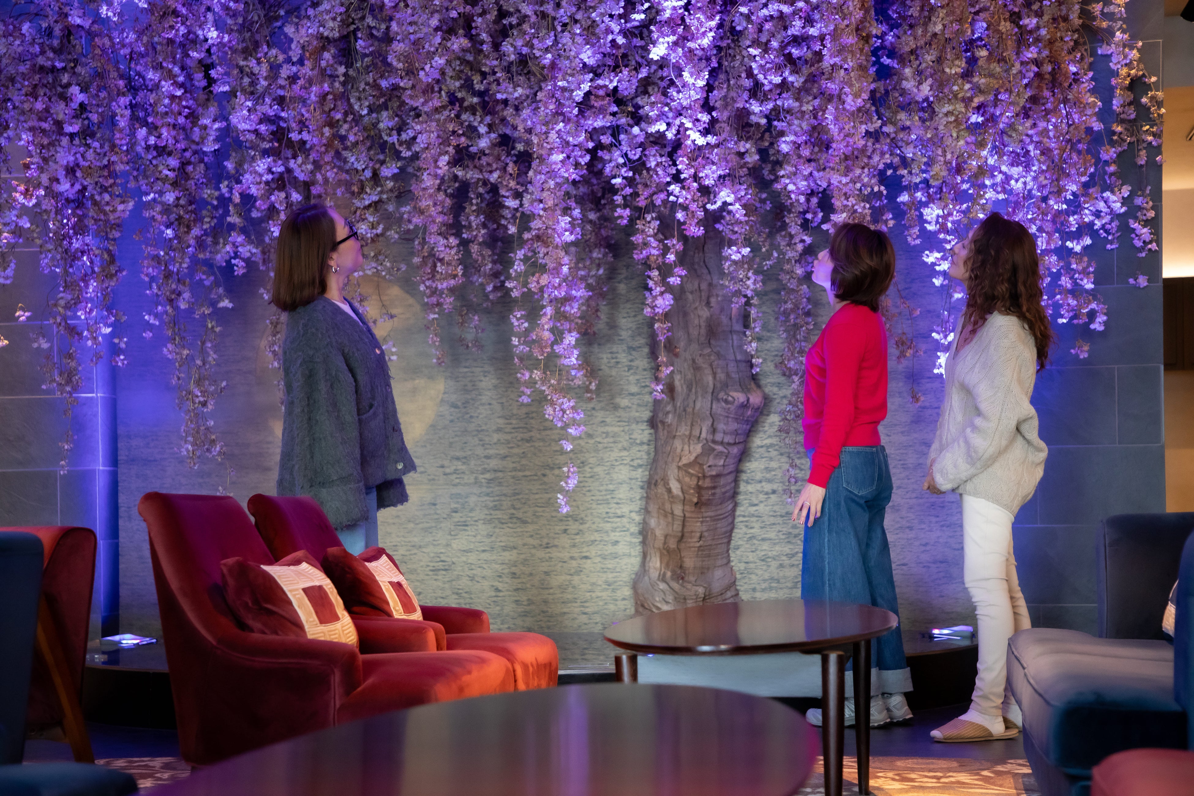 櫻越しのラウンジで寛ぐ様子