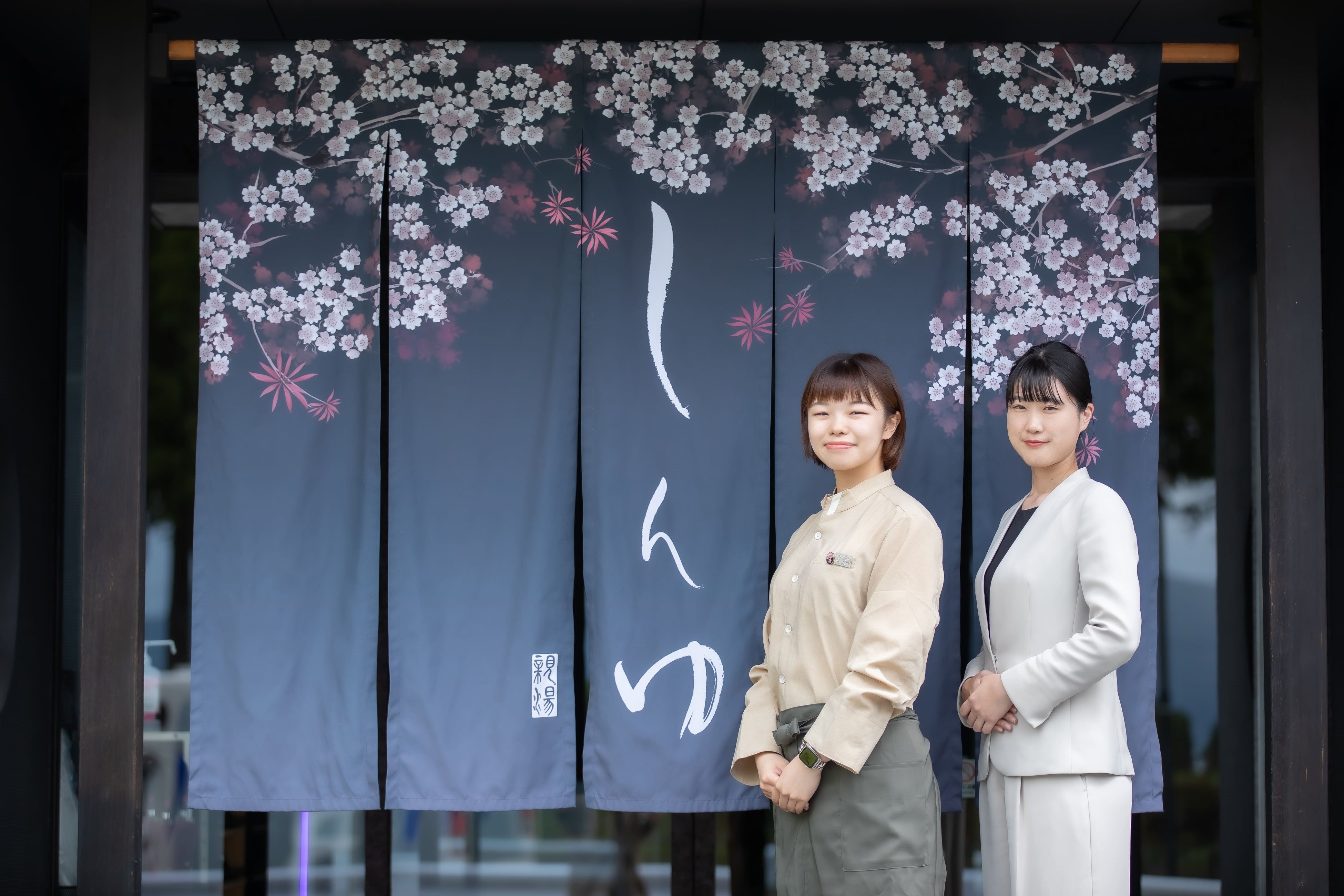 「上諏訪温泉しんゆ」の暖簾とお出迎えをするスタッフ