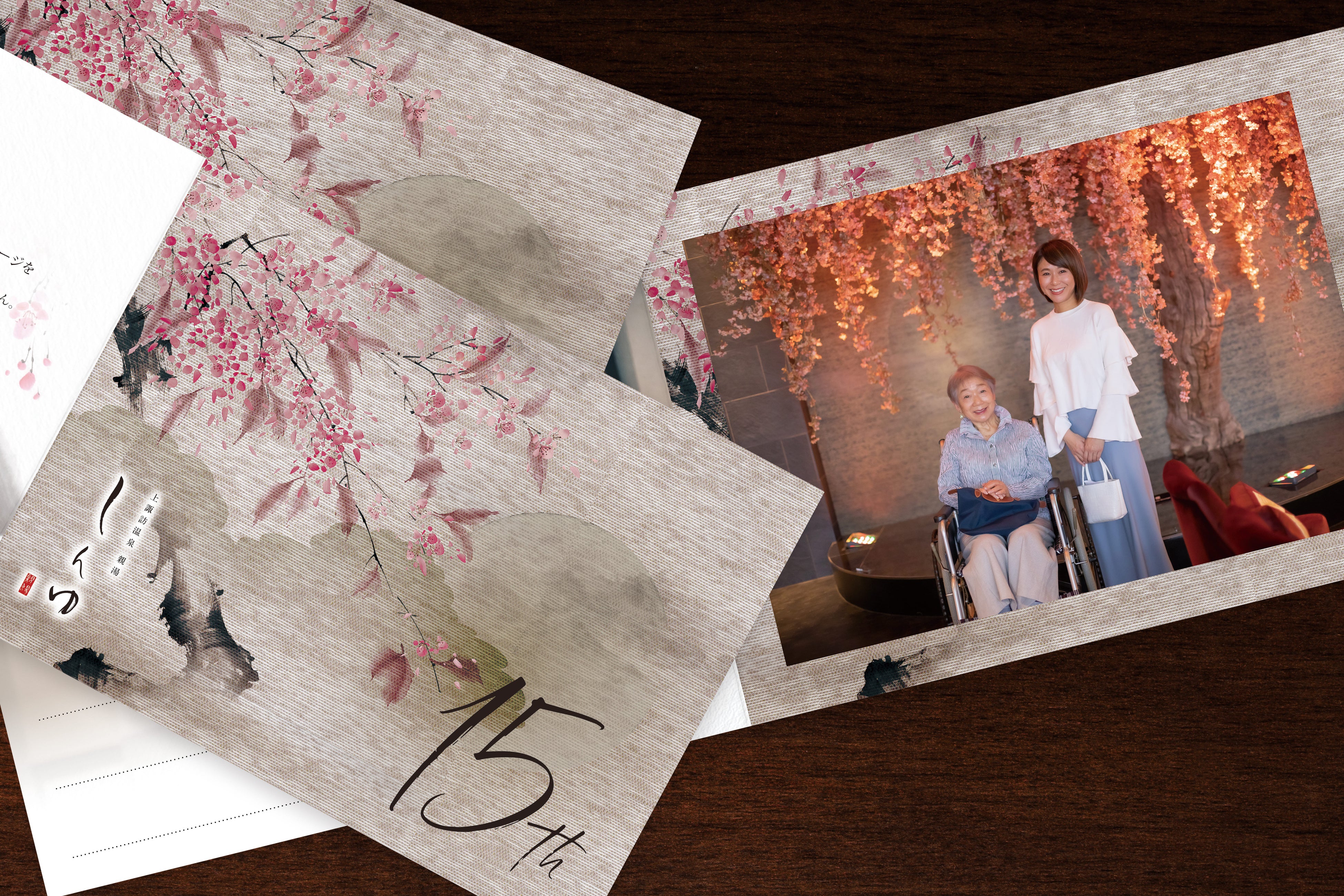15周年に因んだ1,500円分の館内利用券は、ラウンジやバー、売店でご利用が可能なので、お食事中のお飲み物やお土産のご購入など滞在をより豊かなものにしてくれます。水墨画巡りは館内の水墨画を巡りながら文字を見つけ、メッセージを完成させる体験型コンテンツ。記念写真のサービスも付いており写真を見るたびに館内での体験が蘇る思い出の品となります。またご夕食時には15周年のプリントが入ったクッキーを添えた「思い出デザートプレート」をご提供。お食事も記憶に残る体験になります。