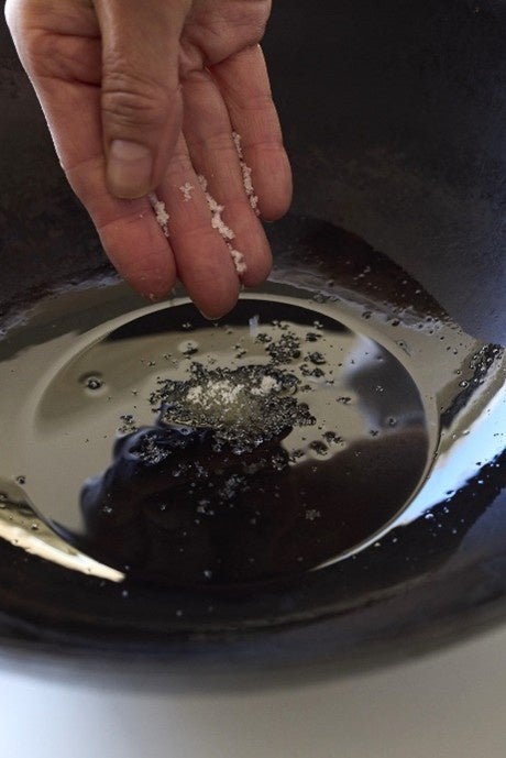 表紙の「目玉焼き」、中に載っている「もやしいため」や「小松菜いため」の作り方には共通の工程があります。それはフライパンに油と塩を入れて熱してから食材を投入すること。こうすることで塩味がまんべんなくいきわたり、野菜はシャキッとした食感に仕上がります。