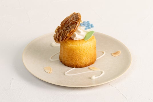 「あじさい」のベースとなるバターケーキに、アーモンドリキュールのシロップを含ませ、中にホワイトチョコレートと練乳のクリームを詰めました。クリームの上には香ばしいアーモンドフロランタンを重ね、チョコレートを加工して作った紫陽花を添えています。さらに練乳ソースとローストアーモンドをあしらい、見た目も上品に仕上げました。