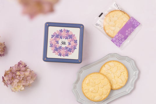 ラスクをヒントに、バターケーキをカットし練乳ソースをしっかり染み込ませ、スライスアーモンドを並べてじっくりと焼き上げた鎌倉紅谷のオリジナル菓子「あじさい」。その誕生50周年を記念し、半世紀にわたるご愛顧への感謝を込めた、特別なデザインで”缶入り”の「あじさい」が登場します。