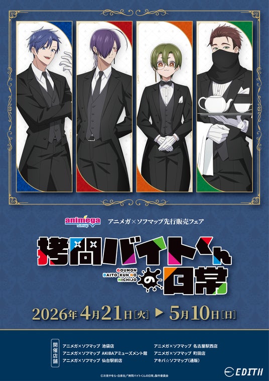 イベント事業・グッズ事業を手掛ける株式会社イーディス(本社:東京都豊島区、代表取締役:森俊平、以下イーディス)は、TVアニメ『拷問バイトくんの日常』より、描き下ろしイラストを使用した商品をアニメガ×ソフマップ一部店舗にて先行販売いたします。