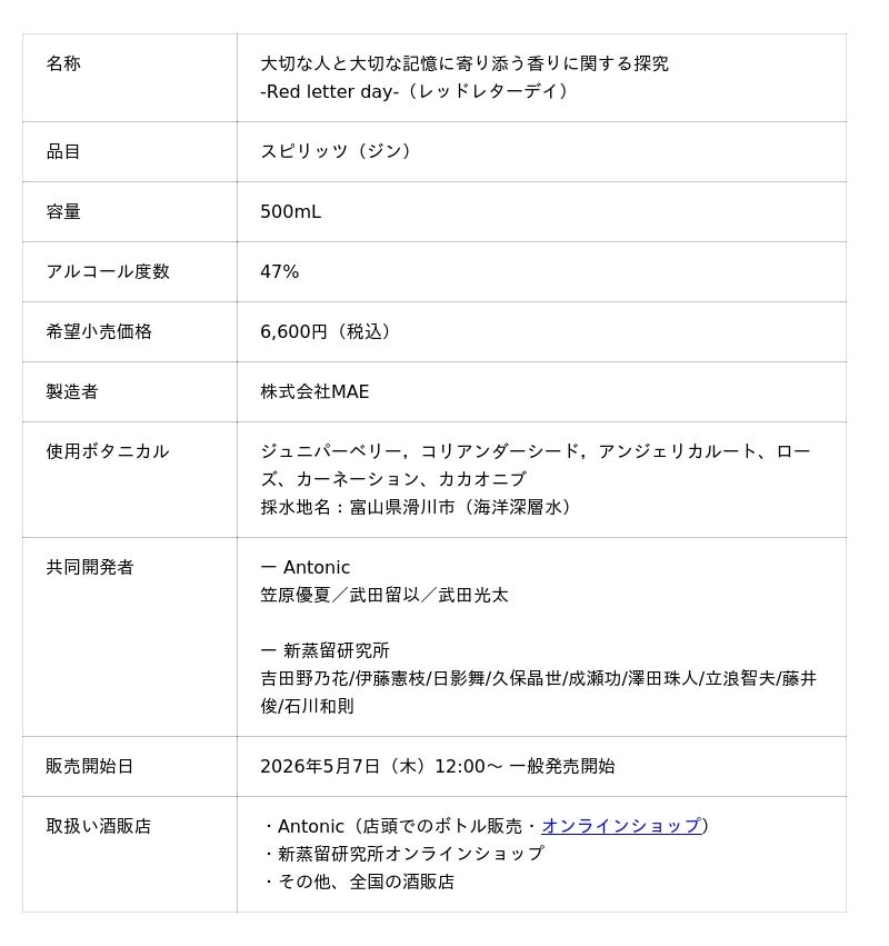 2026年5月発売 <本プロジェクト> 新蒸留研究所×Antonic「大切な人と大切な記憶に寄り添う香りに関する探究 -Red letter day-」