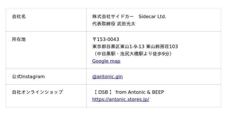 中目黒のジントニック専門店 The World Gin&Tonic〔Antonic〕(ザ ワールドジンアンドトニック アントニック)を運営する株式会社サイドカー(本社:東京都目黒区、代表取締役:武田光太)。