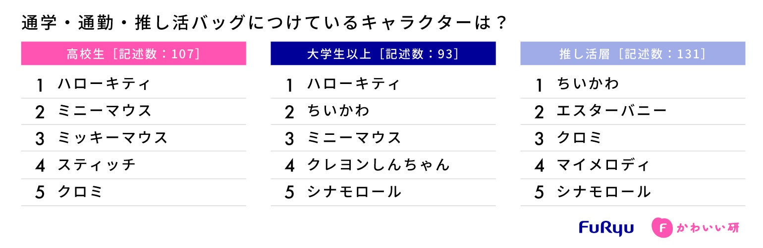 女子高校生が通学バッグに付けるキャラクターのTOP5には「ハローキティ」「クロミ」といったサンリオキャラクター、「ミニーマウス」「ミッキーマウス」「スティッチ」がランクイン。サンリオキャラクターとディズニーキャラクターに人気が集まりました。大学生以上、推し活層を対象とした調査では、「ちいかわ」や「クレヨンしんちゃん」「エスターバニー」なども登場する結果となりました。また、推し活層では女子高校生・大学生以上の回答よりも、アニメ・漫画作品のキャラクター名の回答数が多いことも特徴の一つでした。