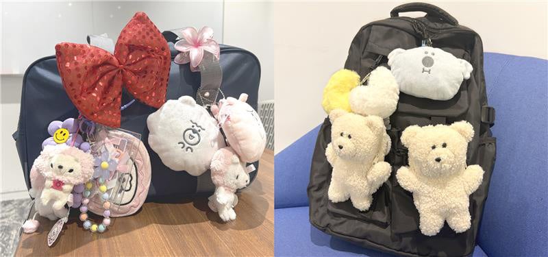 バッグをチャームやキーホルダーなどで飾り付ける“じゃら付け”イメージ(フリュー作成)。16歳~25歳の女性の約80%が“じゃら付け経験者”という結果も