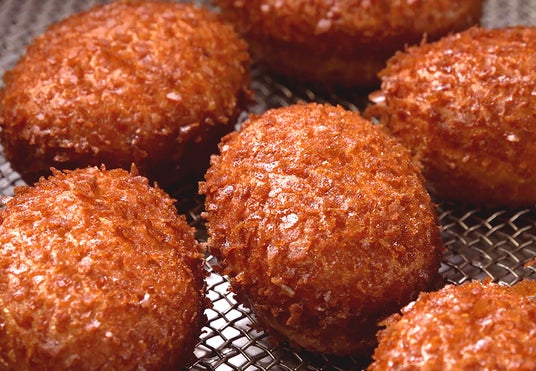 「東京ばな奈のクリームあんドーナツ」北海道の大地が育てた小豆が香るこしあんに、「東京ばな奈」謹製のバナナカスタードクリームをとろっと掛けた逸品。カスタードからこぼれるコクとバナナ風味がとろとろ溶けて混じり合います。