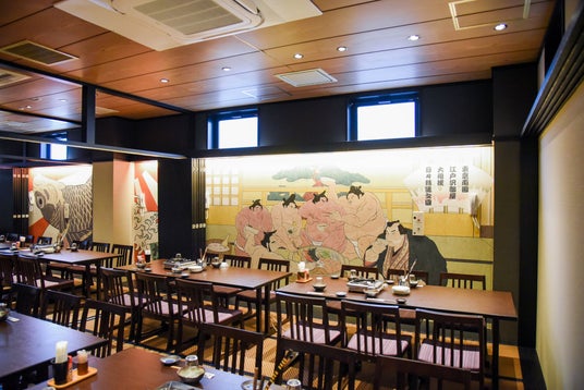 3. 和モダンな個室空間店内は和を基調とした、木目の優しさと畳が香るモダンな雰囲気です。店内に描かれている相撲絵は、日本の伝統文化に触れながら食事を楽しめると海外からのお客様にも大変人気です。大小さまざまな個室をご用意しているため、プライベートな食事会にも最適です。