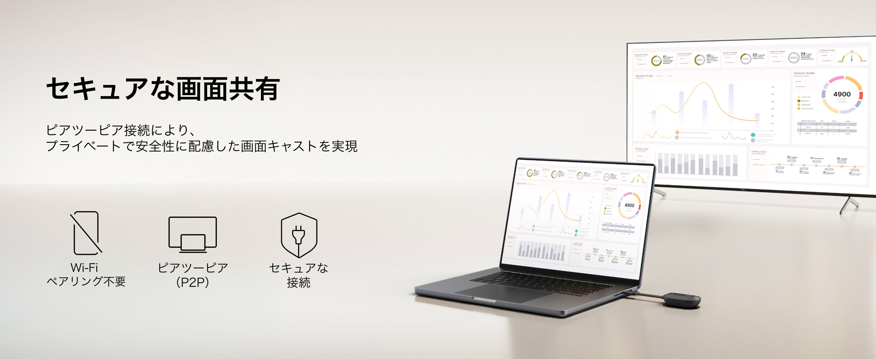 安心安全なピアツーピア(P2P)接続:既存のネットワークを介さないP2P(ピアツーピア)接続を採用しました。社内Wi-Fiへのペアリングが不要なため、部外者によるアクセスや情報漏洩のリスクを抑えられ、ビジネスシーンでも安心して画面をキャストできます。