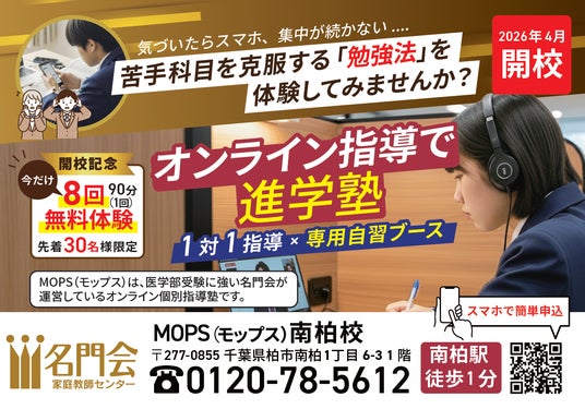 株式会社リソー教育グループ(本社:東京都豊島区、代表取締役:天坊真彦)の子会社である、株式会社名門会(本社:東京都豊島区、代表取締役:吉田信司)は2026年4月29日(水)、千葉県南柏駅徒歩1分の立地に、双方向型オンライン個別指導塾「名門会オンラインパーソナルスクール(MOPS/モップス)南柏校」を新規開校いたします。